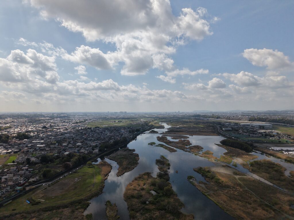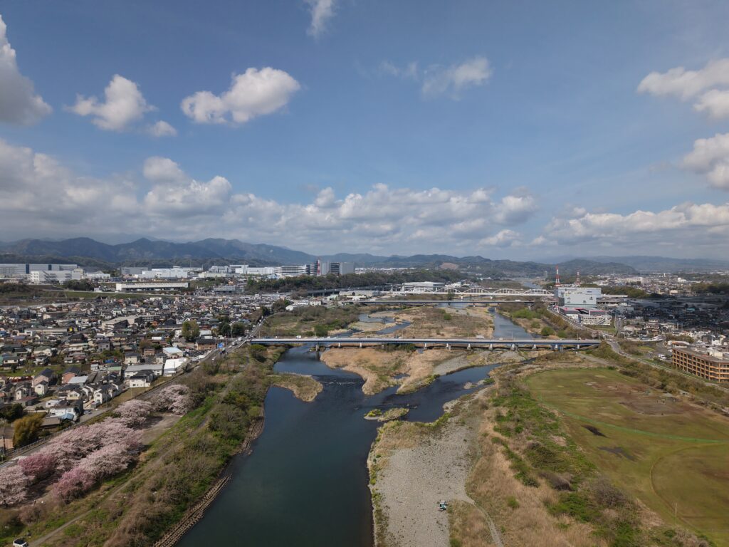 この日は朝から雲ひとつない快晴。風もほとんどなく、春らしい暖かさに包まれた絶好のフライトコンディションでした。川の流れも穏やかで、空から見下ろす景色はとても落ち着いた表情を見せてくれます。