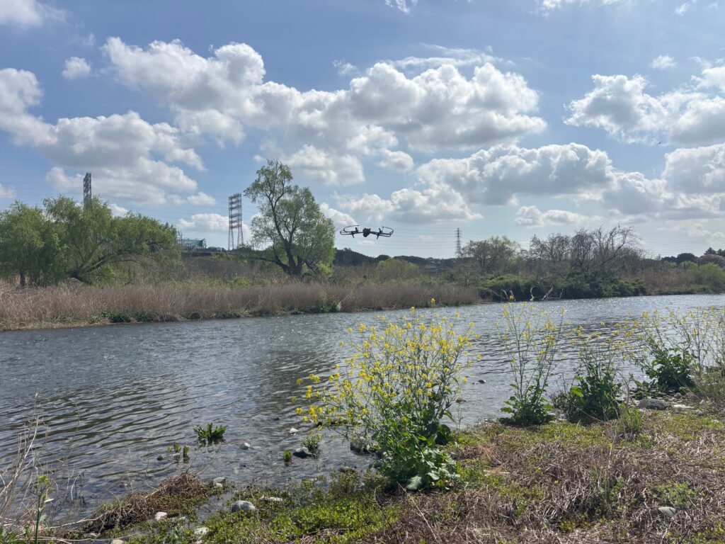 2026年4月6日の午前中、神奈川県を流れる相模川でドローン空撮を行いました。